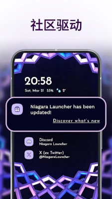 我们深知简洁的力量,因此 Niagara Launcher 的设计旨在为您提供一个没有干扰的纯净空间。极致轻量与闪电般的响应速度是其另一大亮点,确保在任何设备上都能流畅运行,且丝毫不占用宝贵的存储空间。此外,Niagara Launcher 完美融合了 Material You 的表现力设计,让您的主屏幕能与壁纸无缝融合,创造出真正个性化的视觉主题,甚至将这一体验带给所有安卓版本。您还可以通过集成或自选的图标包、字体和壁纸,进一步定制您的独特界面。这不仅是一个应用,更是一个积极发展且拥有热情社区的生态系统,欢迎您的加入。